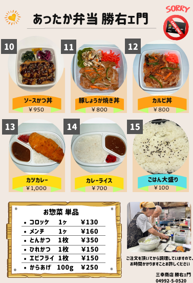 観光土産店から始まり、食堂、精肉店と、時代の変化に合わせて柔軟に業態を変えながら営業を続けてこられました。現在は心のこもった手作り弁当を中心に、地元の方々や観光客の皆さんに親しまれています。